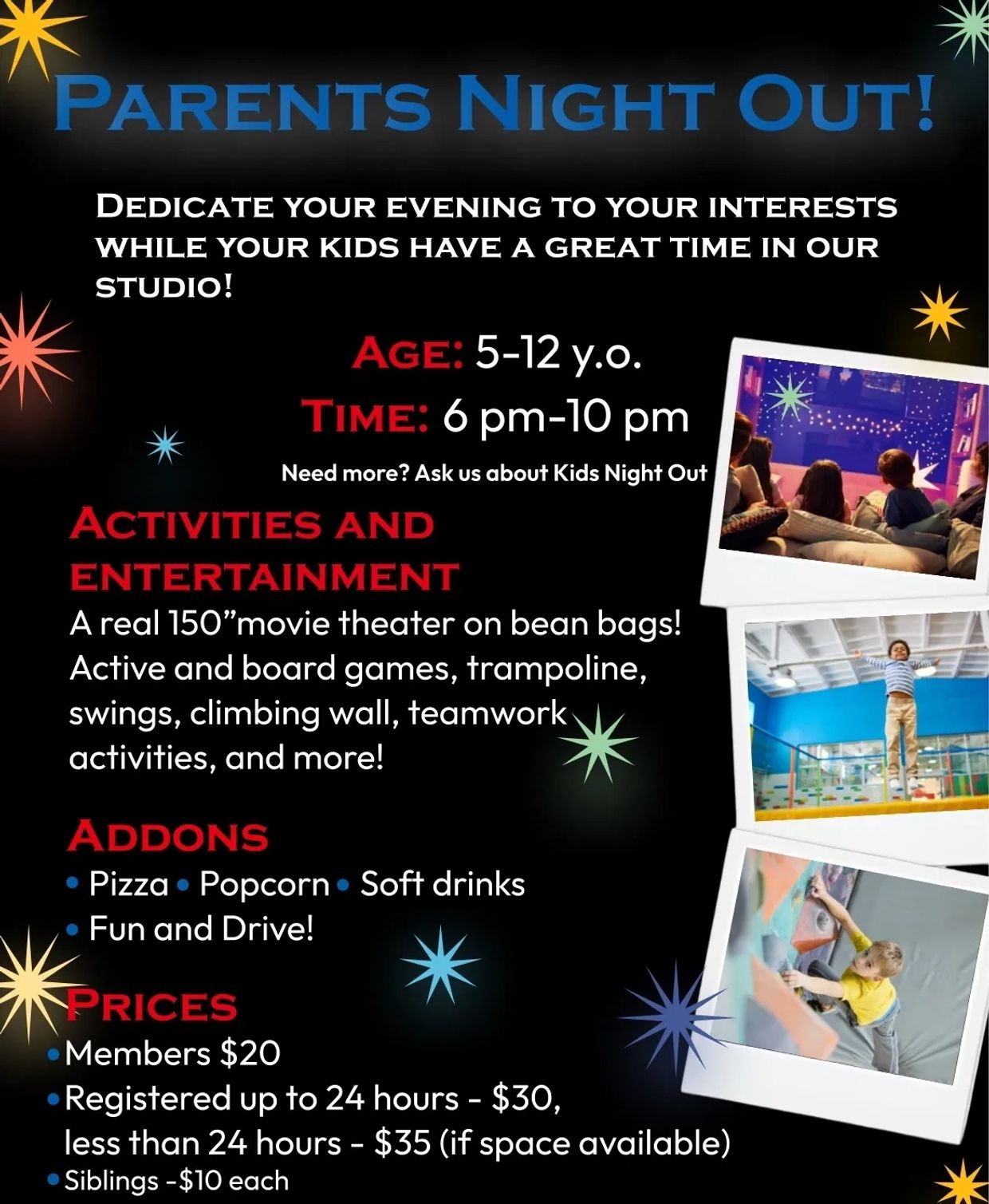 The standard Parents Night Out program runs from 6 pm to 10 pm. But sometimes, you may need even more time, and in that case, you can inquire about our Kids Night Out program!